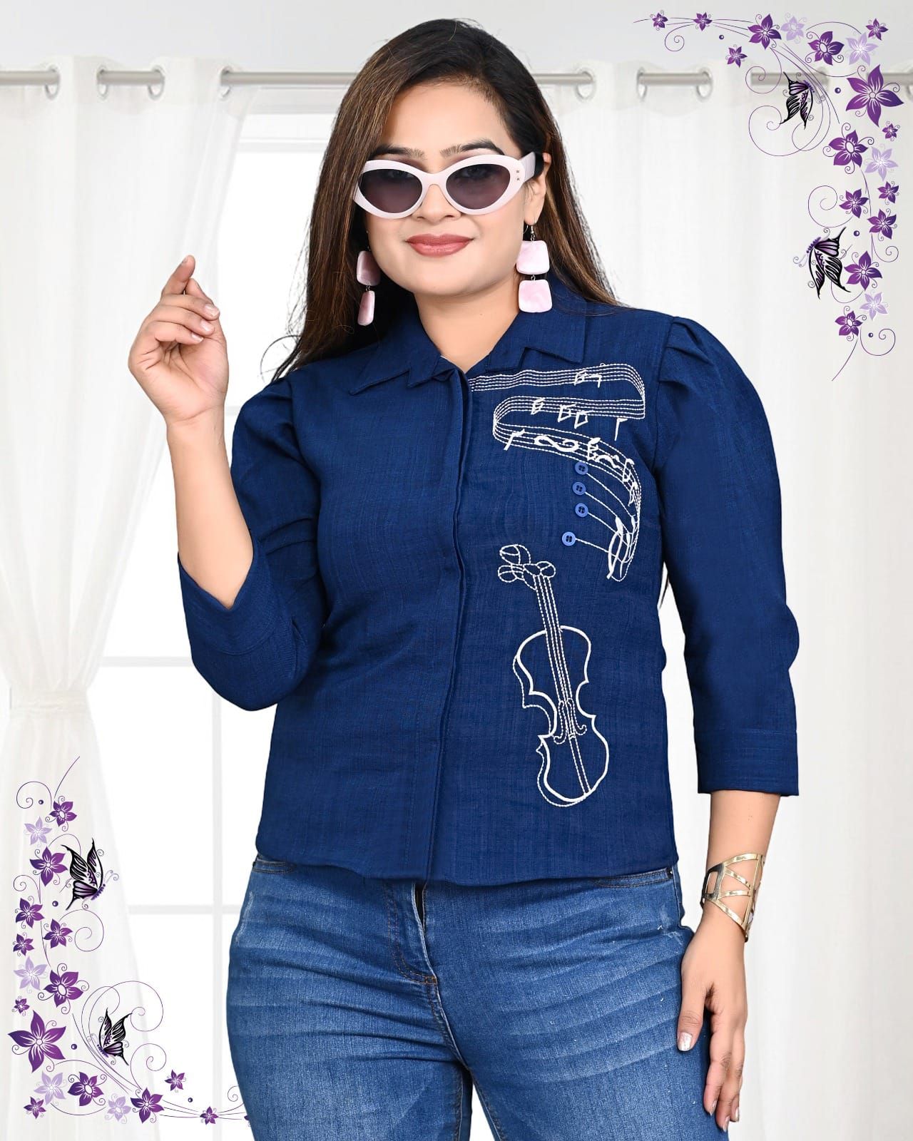 The background is a bright indoor setting with white curtains and decorative purple floral and butterfly wall stickers, giving it a whimsical, feminine feel.